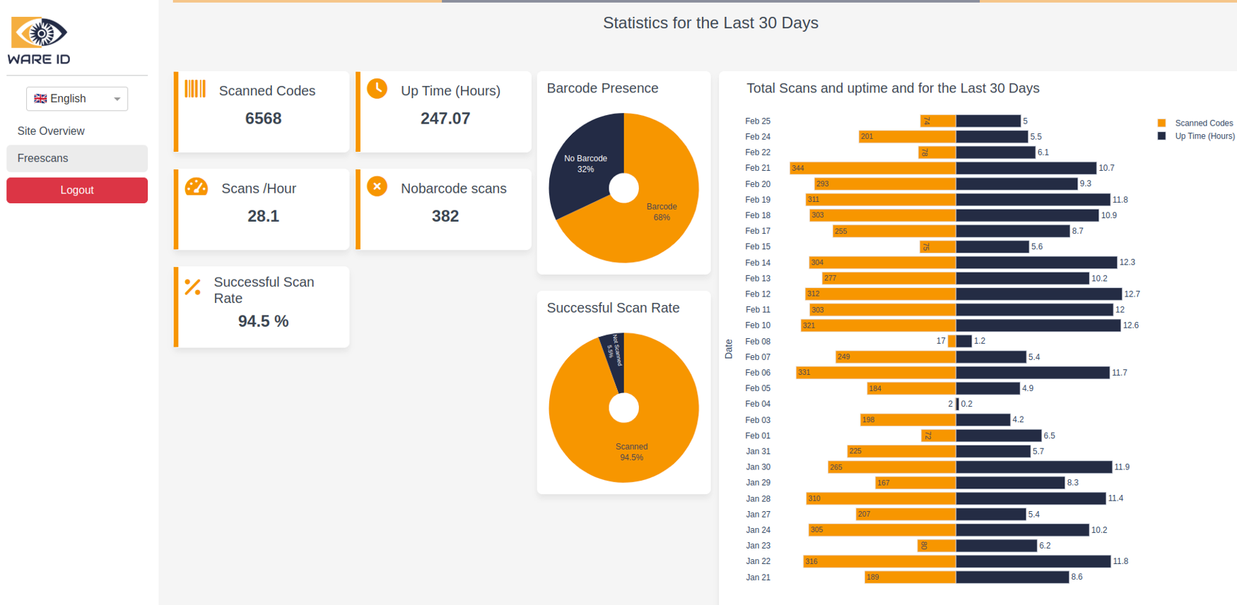 WARE ID a développé, une solution logicielle qui permet de visualiser l’ensemble des données collectées par le FREESCAN. Il devient facile de récupérer des statistiques de lecture et des photos de vos palettes scannées à chaque mission de votre process.